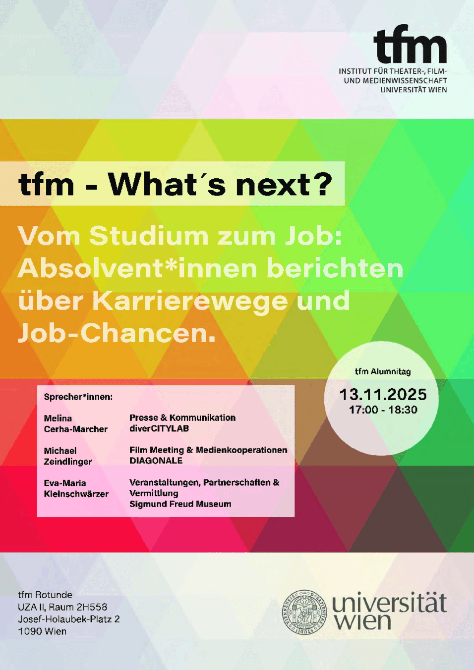 Auch heuer berichten wieder drei tfm-Absolvent*innen von ihren Einstiegen in die Berufswelt und stehen anschließend für Fragen zur Verfügung.